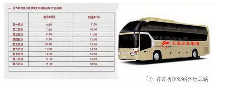 機(jī)場(chǎng)巴士往返于齊齊哈爾與哈爾濱太平國(guó)際機(jī)場(chǎng)間,全程運(yùn)行約3小時(shí)50分鐘。行程360公里,中途在大慶紅湖服務(wù)區(qū)???分鐘,大慶機(jī)場(chǎng)可上下。大慶機(jī)場(chǎng)運(yùn)行兩小時(shí)。